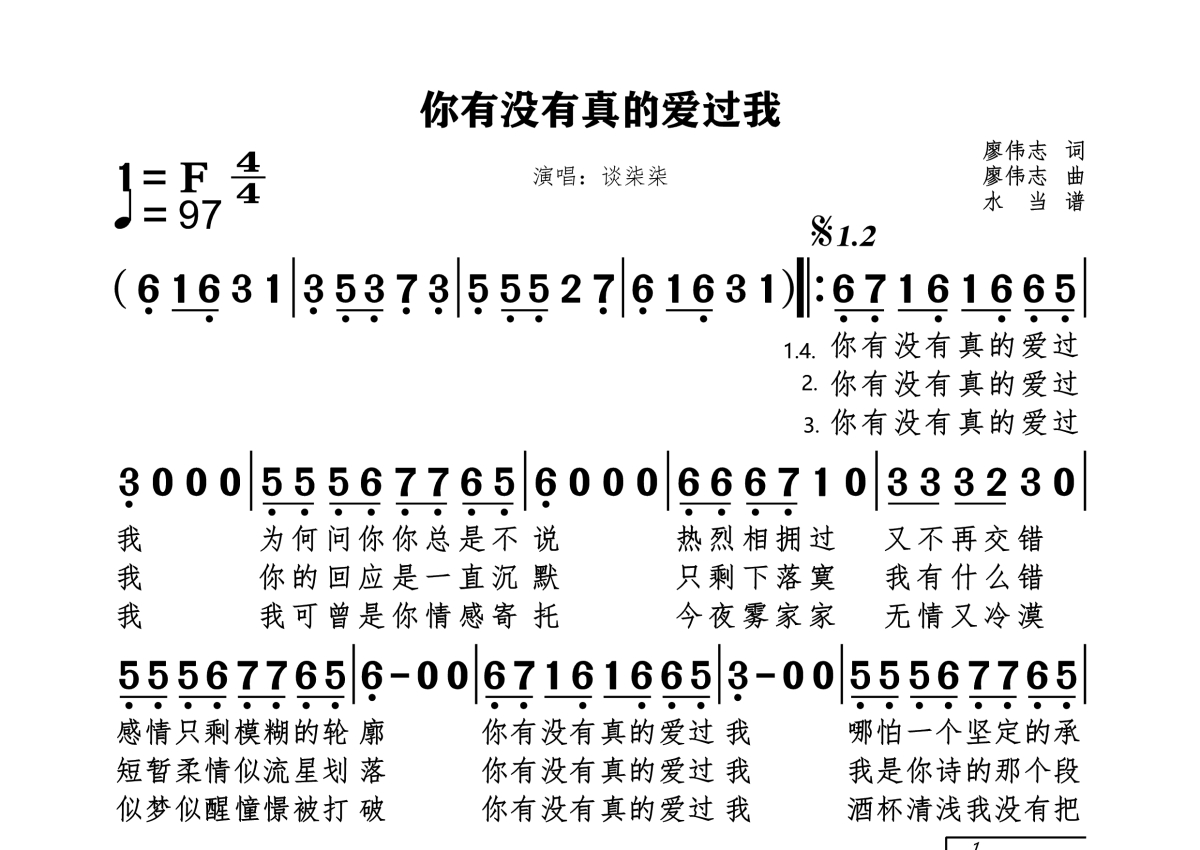 《你有没有真的爱过我》是谈柒柒演唱的一首歌曲,拍号为4/4拍,歌曲速度为每分钟97拍,这份简谱共有一张高清图谱,图谱由 @水当 编配上传。