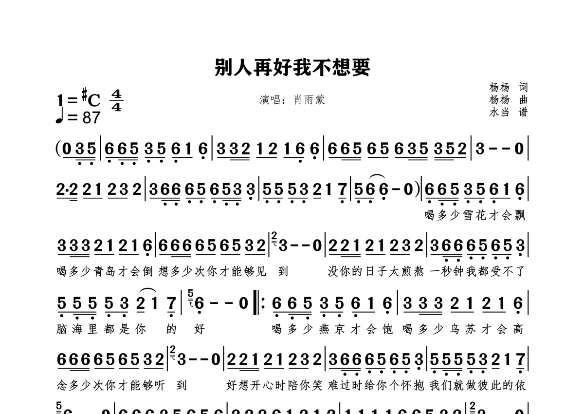 《别人再好我不想要》是肖雨蒙演唱的一首歌曲,拍号为4/4拍,这份简谱共有一张高清图谱,图谱由 @水当 编配上传。