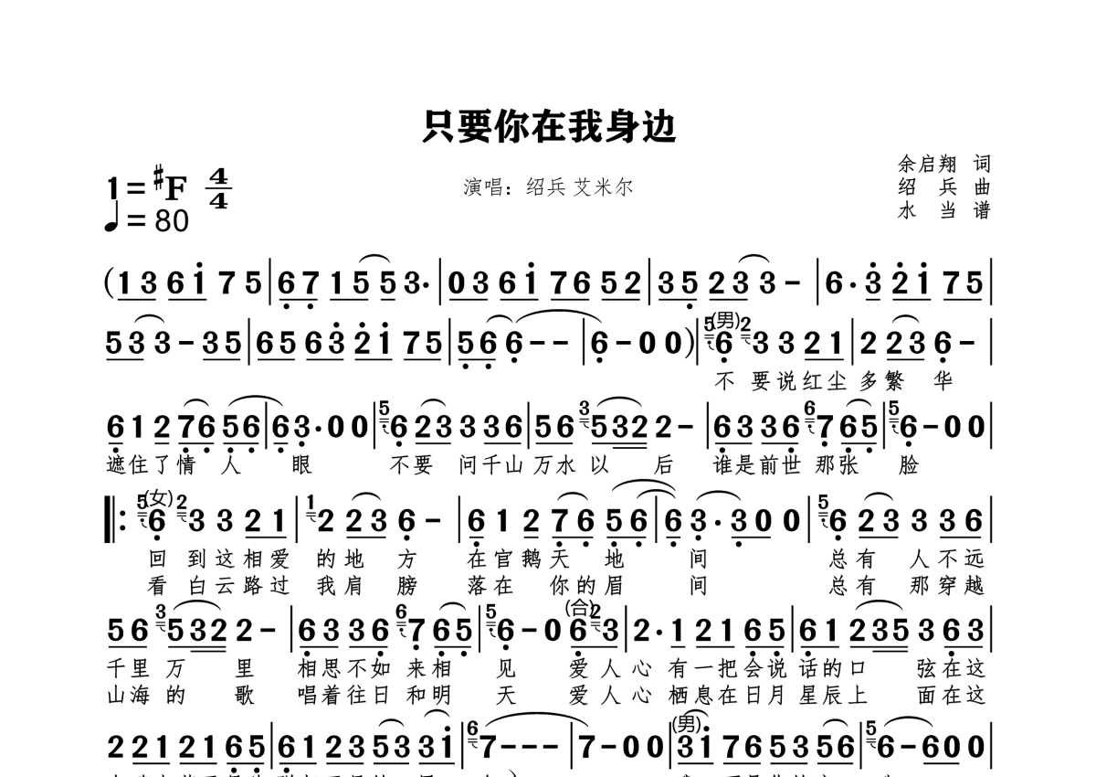 《只要你在我身边》是绍兵&艾米尔演唱的一首歌曲,拍号为4/4拍,这份简谱共有一张高清图谱,图谱由 @水当 编配上传。