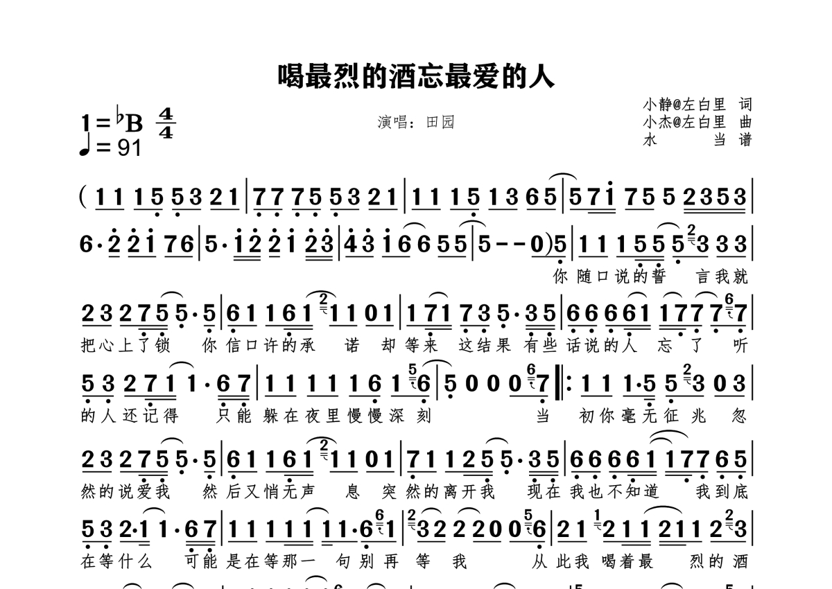 《喝最烈的酒忘最爱的人》是田园演唱的一首歌曲,拍号为4/4拍,歌曲速度为每分钟91拍,这份简谱共有一张高清图谱,图谱由 @水当 编配上传。
