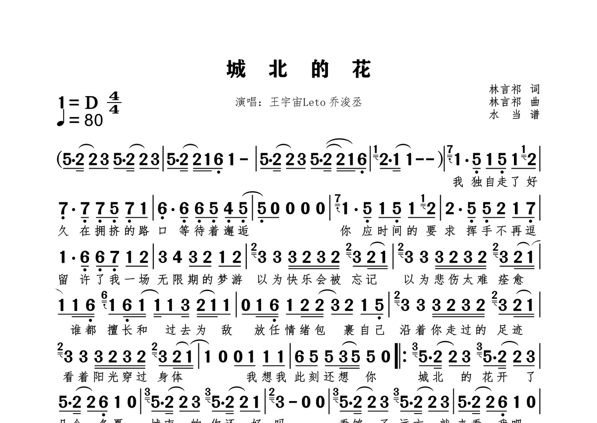 《城北的花》是王宇宙Leto&乔浚丞演唱的一首歌曲,拍号为4/4拍,歌曲速度为每分钟80拍,这份简谱共有一张高清图谱,图谱由 @水当 编配上传。