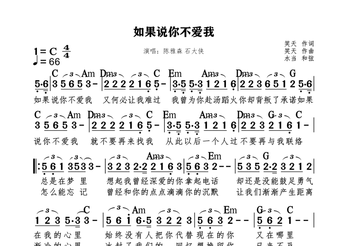 《如果说你不爱我》是陈雅森&石大侠演唱的一首歌曲,拍号为4/4拍,歌曲速度为每分钟66拍,这份简谱共有一张高清图谱,图谱由 @水当 编配上传。