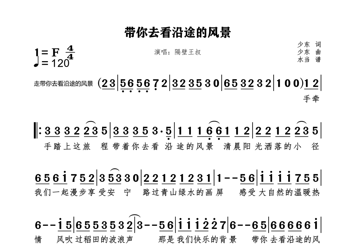 《带你去看沿途的风景》是隔壁王叔演唱的一首歌曲,拍号为4/4拍,歌曲速度为每分钟120拍,这份简谱共有一张高清图谱,图谱由 @水当 编配上传。