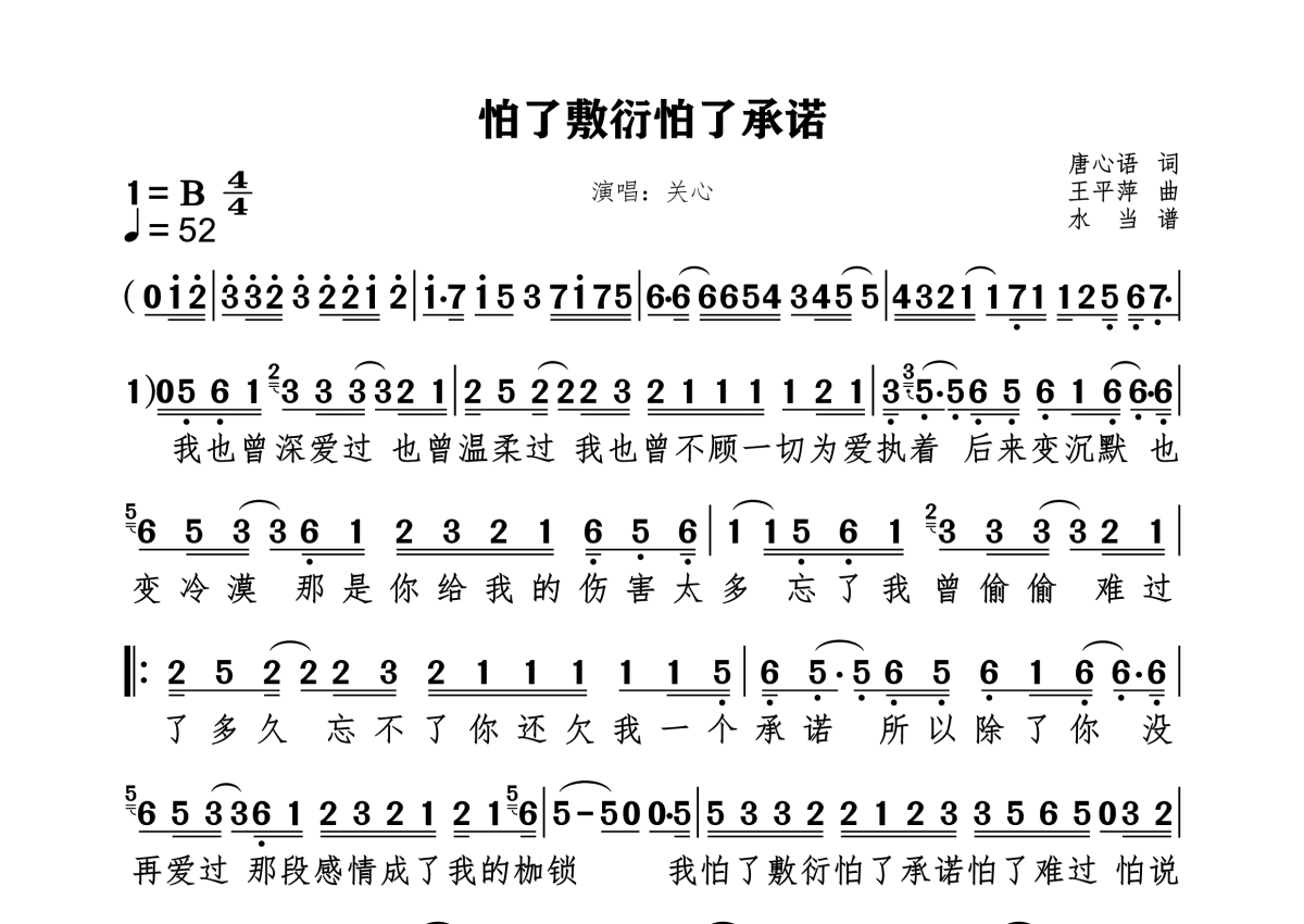 《怕了敷衍怕了承诺》是关心演唱的一首歌曲,拍号为4/4拍,这份简谱共有一张高清图谱,图谱由 @水当 编配上传。
