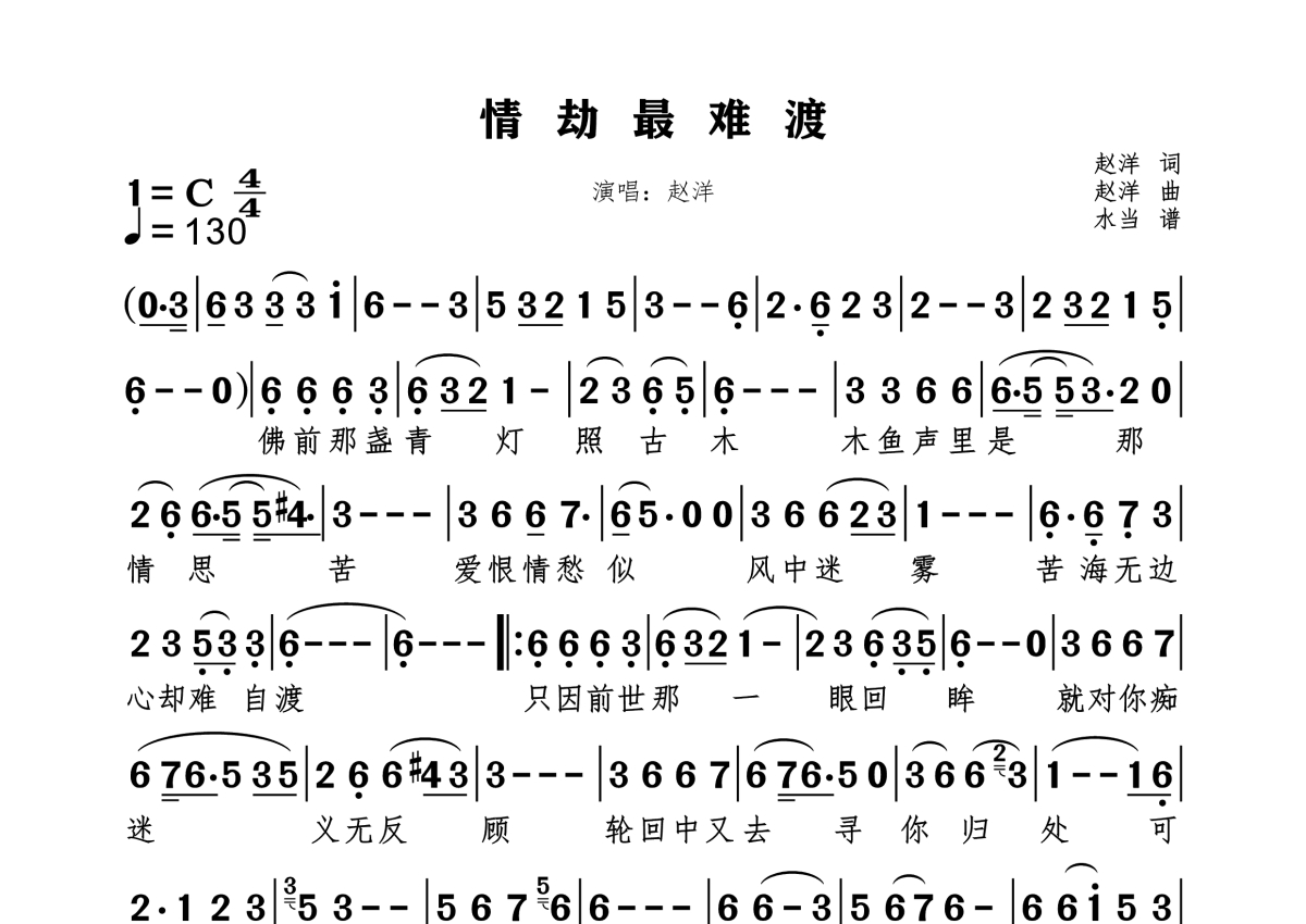 《情劫最难渡》是赵洋演唱的一首歌曲,拍号为4/4拍,歌曲速度为每分钟130拍,这份简谱共有一张高清图谱,图谱由 @水当 编配上传。