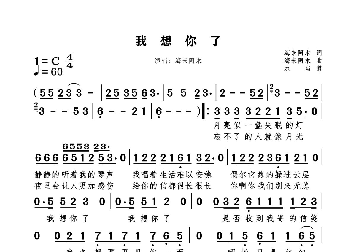 《我想你了》是海来阿木演唱的一首歌曲,拍号为4/4拍,歌曲速度为每分钟60拍,这份简谱共有一张高清图谱,图谱由 @水当 编配上传。