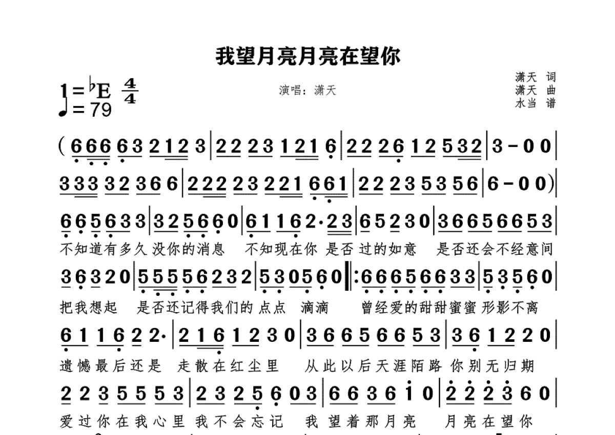 《我望月亮月亮在望你》是潇天演唱的一首歌曲,拍号为4/4拍,这份简谱共有一张高清图谱,图谱由 @水当 编配上传。