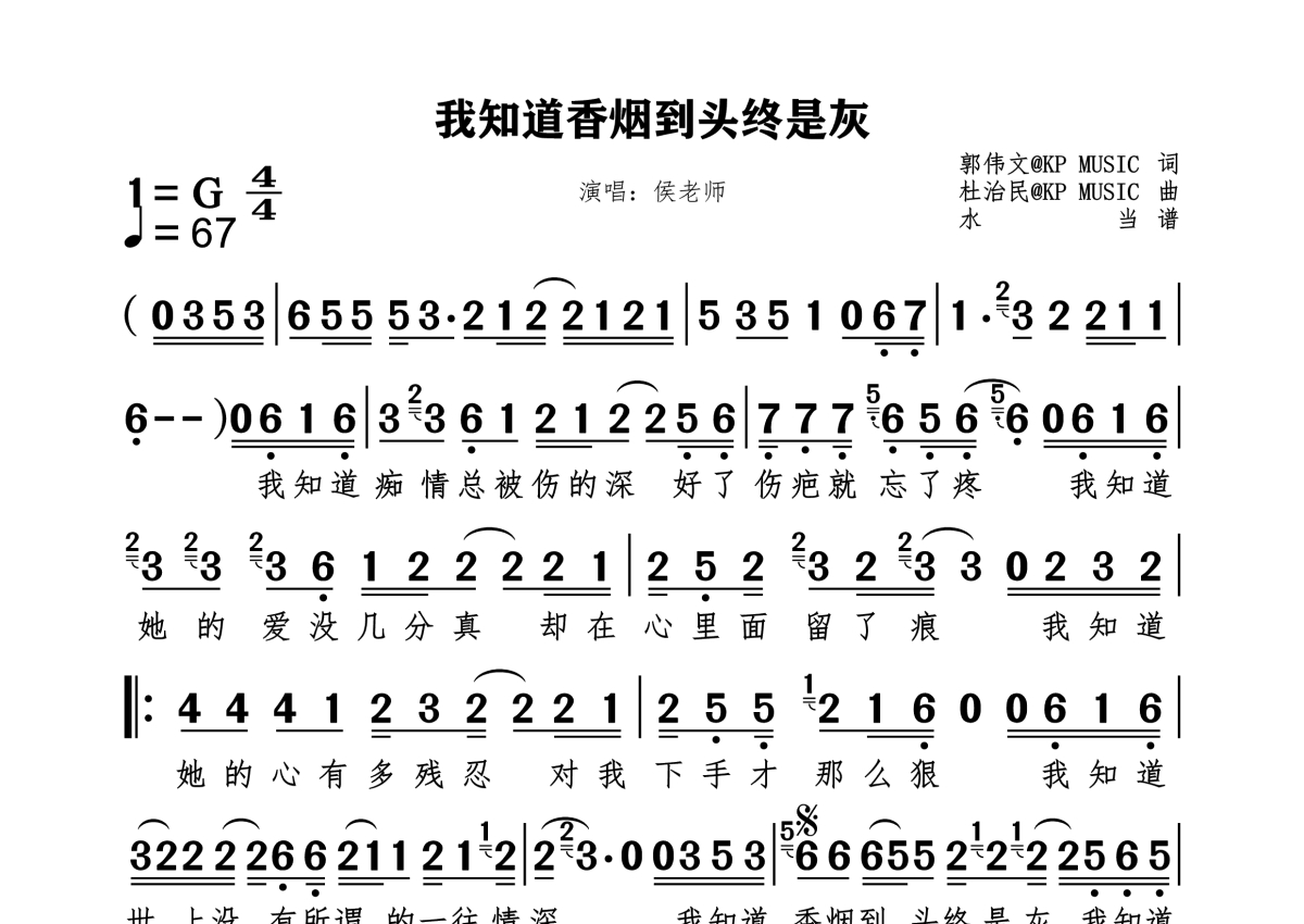 《我知道香烟到头终是灰》是侯老师演唱的一首歌曲,拍号为4/4拍,歌曲速度为每分钟67拍,这份简谱共有一张高清图谱,图谱由 @水当 编配上传。