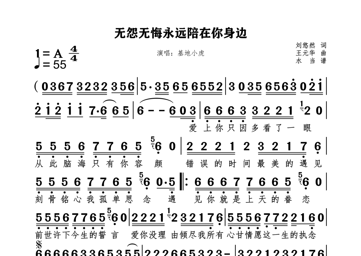 基地小虎《无怨无悔永远陪在你身边》简谱