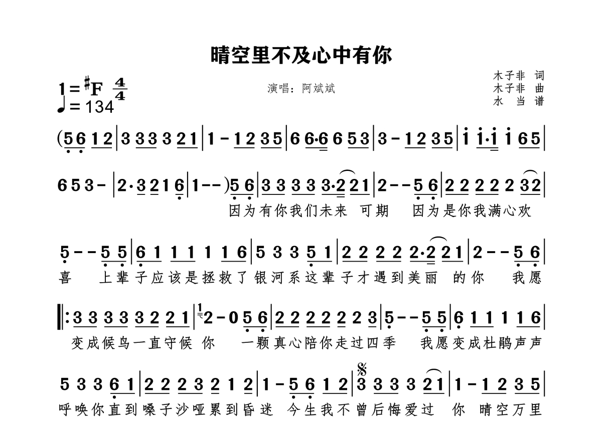 《晴空里不及心中有你》是阿斌斌演唱的一首歌曲,拍号为4/4拍,这份简谱共有一张高清图谱,图谱由 @水当 编配上传。