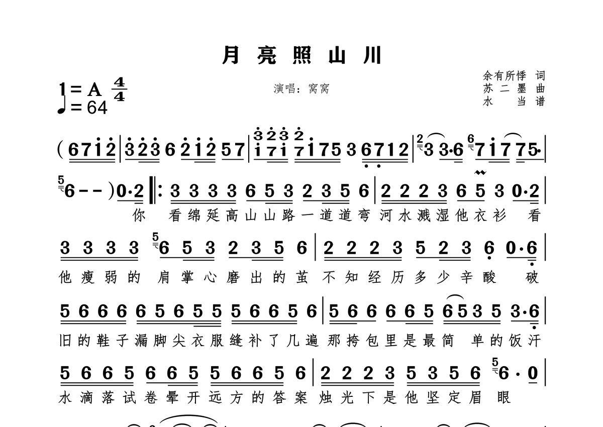 《月亮照山川》是窝窝演唱的一首歌曲,拍号为4/4拍,这份简谱共有一张高清图谱,图谱由 @水当 编配上传。
