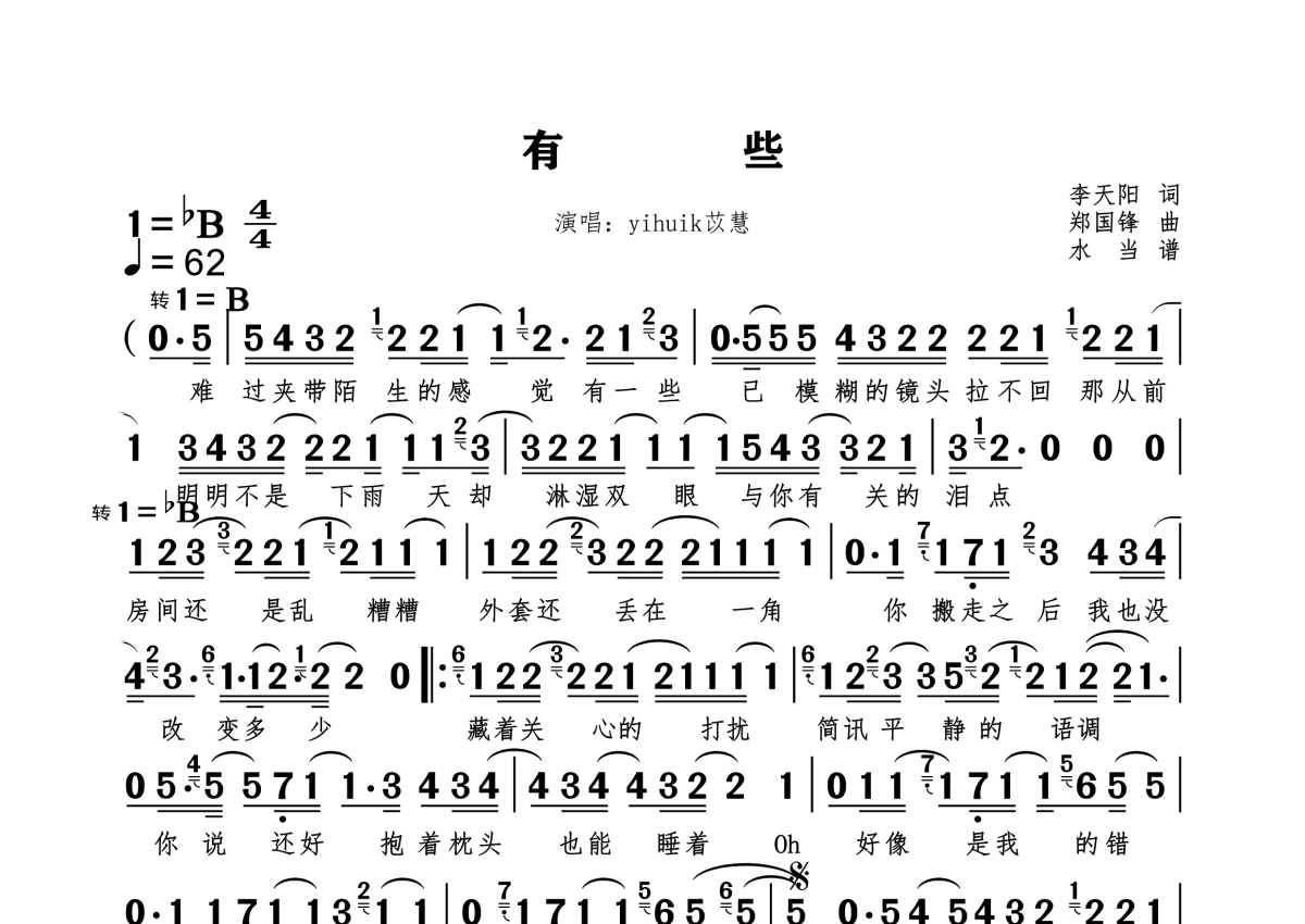 《有些》是yihuik苡慧演唱的一首歌曲,拍号为4/4拍,这份简谱共有一张高清图谱,图谱由 @水当 编配上传。