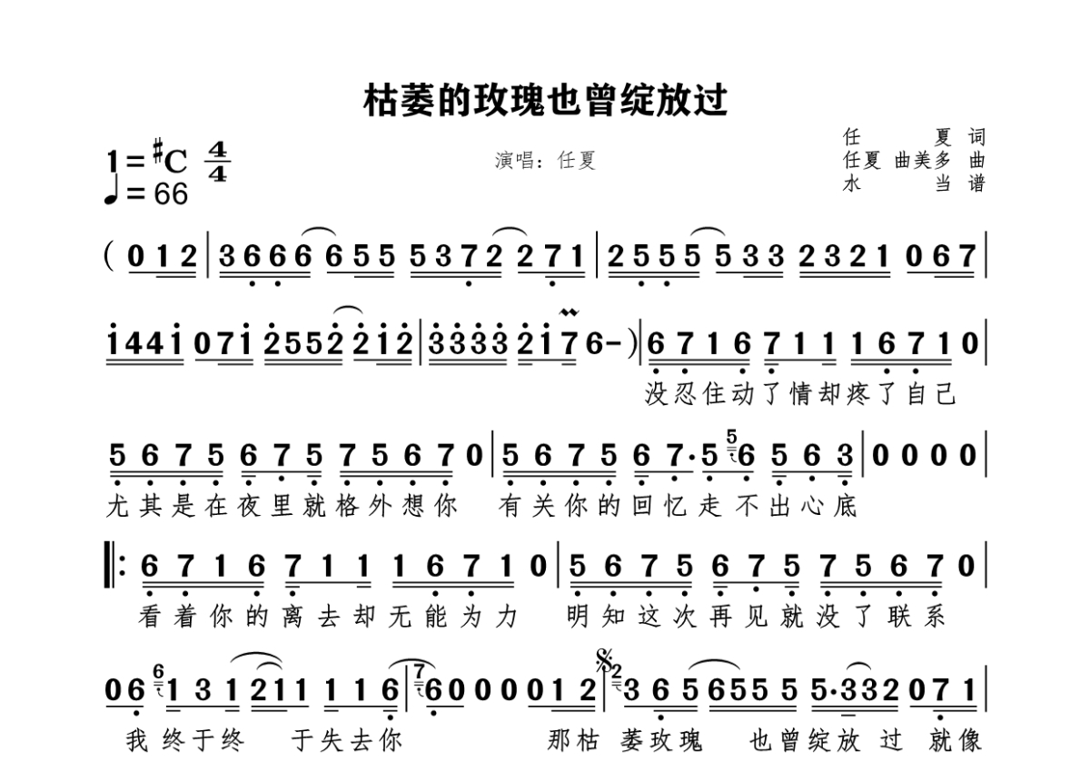《枯萎的玫瑰也曾绽放过》是任夏演唱的一首歌曲,拍号为4/4拍,这份简谱共有一张高清图谱,图谱由 @水当 编配上传。
