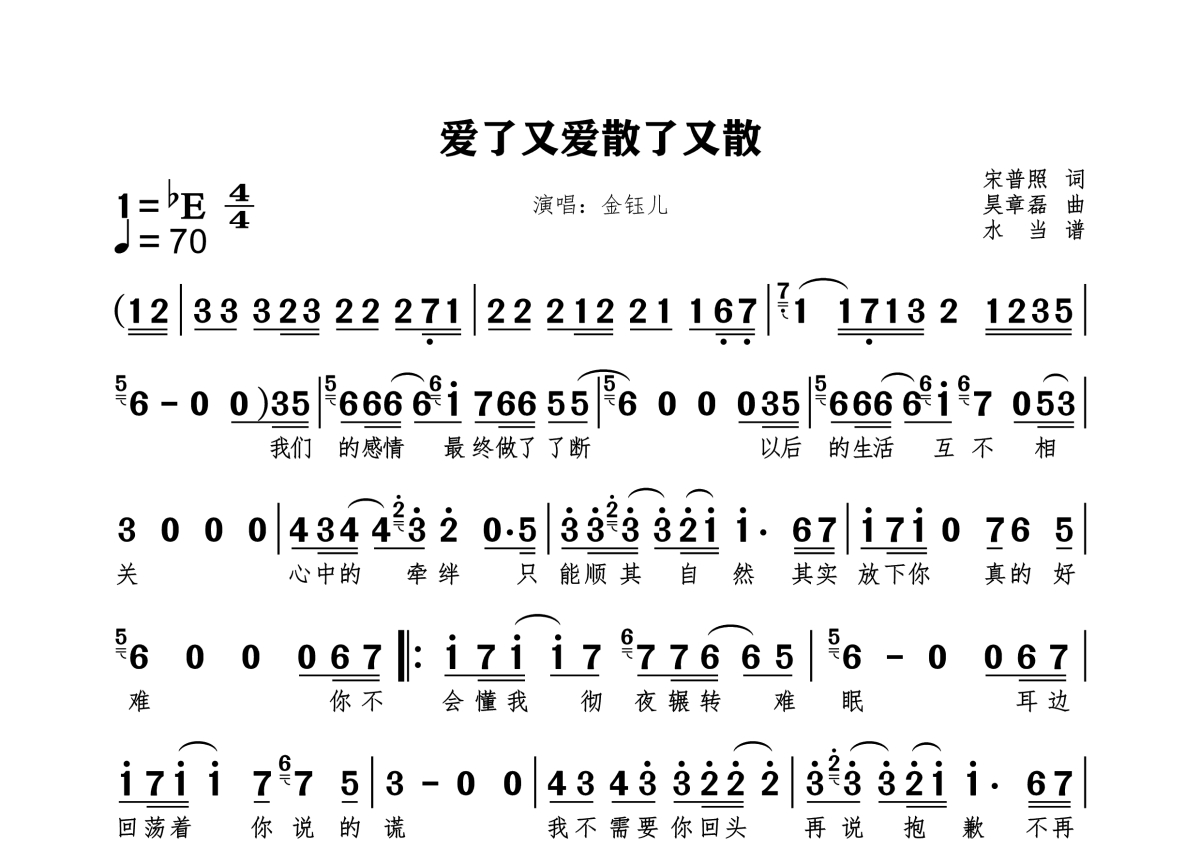 《爱了又爱散了又散》是金钰儿演唱的一首歌曲,拍号为4/4拍,歌曲速度为每分钟70拍,这份简谱共有一张高清图谱,图谱由 @水当 编配上传。