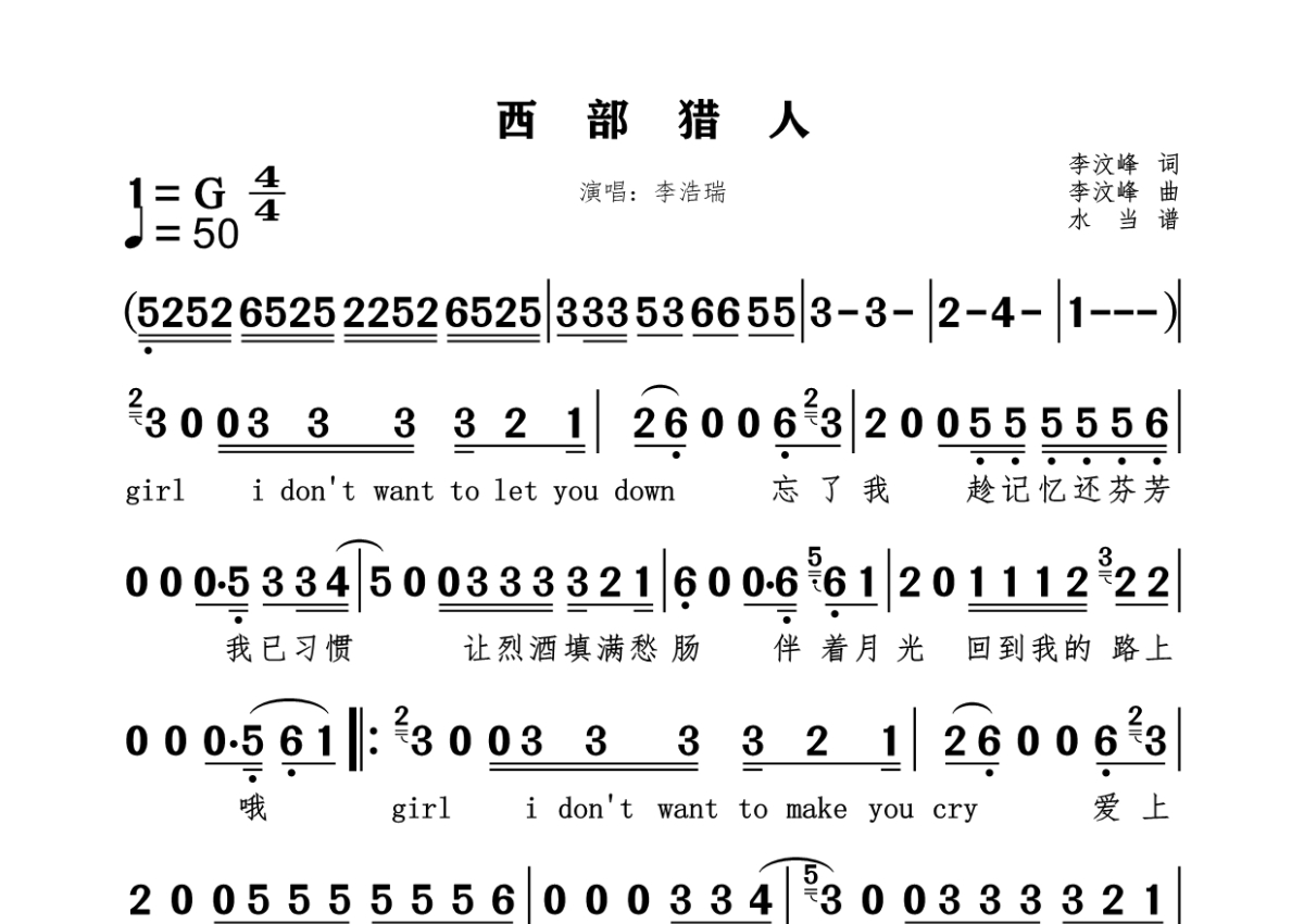 《西部猎人》是李浩瑞演唱的一首歌曲,拍号为4/4拍,这份简谱共有一张高清图谱,图谱由 @水当 编配上传。