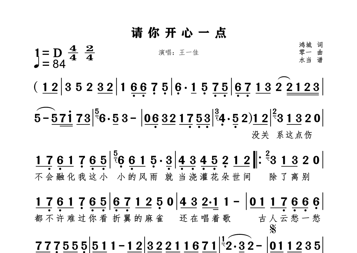 《请你开心一点》是王一佳演唱的一首歌曲,拍号为4/4拍,这份简谱共有一张高清图谱,图谱由 @水当 编配上传。
