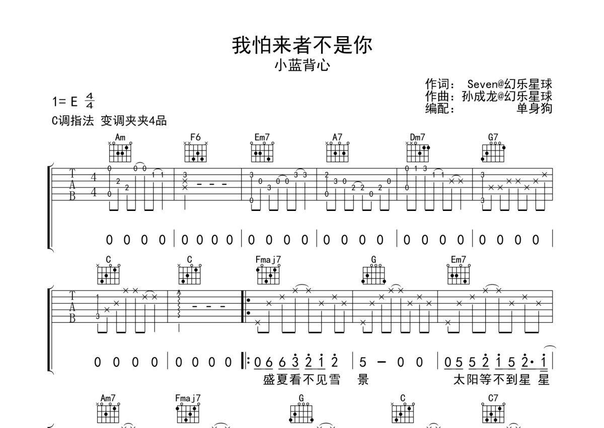 《我怕来者不是你》是小蓝背心演唱的一首歌曲,本吉他谱采用的是C调指法编配,这份吉他谱共有两张高清图谱,图谱由 @单身狗 编配上传,图谱使用六线谱编配,包含吉他和弦指法、简谱以及歌词部分,使用这份我怕来者不是你吉他谱,可以让你更加方便地掌握这首歌曲的弹唱技巧,快来尝试吧。小蓝背心《我怕来者不是你》吉他弹唱谱,采用C调指法编配,单身狗编配出品,共有2张高清图谱,免翻页排版设计。