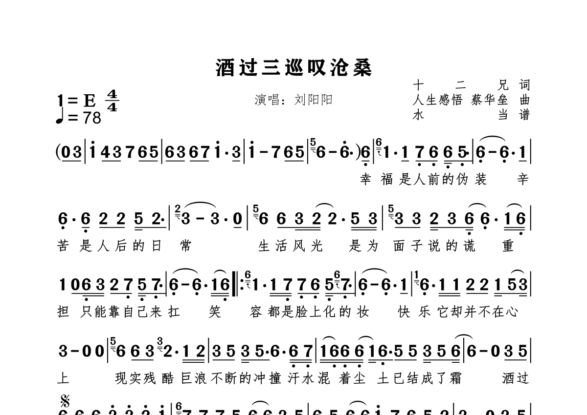 《酒过三巡叹沧桑》是刘阳阳演唱的一首歌曲,拍号为4/4拍,歌曲速度为每分钟78拍,这份简谱共有一张高清图谱,图谱由 @水当 编配上传原调E纯简谱。