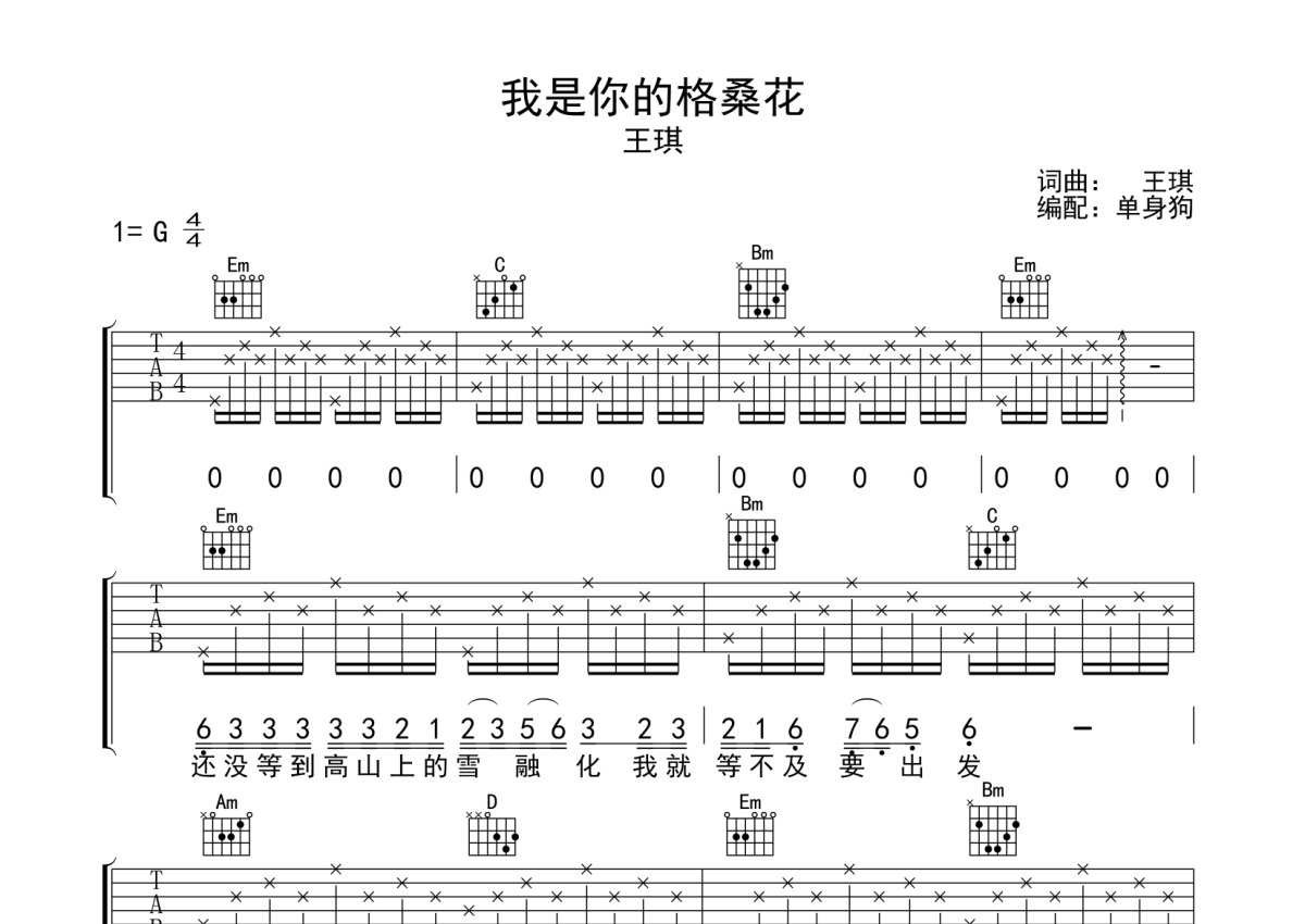 《我是你的格桑花》是王琪演唱的一首歌曲,本吉他谱采用的是G调指法编配,这份吉他谱共有三张高清图谱,图谱由 @单身狗 编配上传,图谱使用六线谱编配,包含吉他和弦指法、简谱以及歌词部分,使用这份我是你的格桑花吉他谱,可以让你更加方便地掌握这首歌曲的弹唱技巧,快来尝试吧。王琪《我是你的格桑花》吉他弹唱谱,采用G调指法编配,单身狗编配出品,共有3张高清图谱。