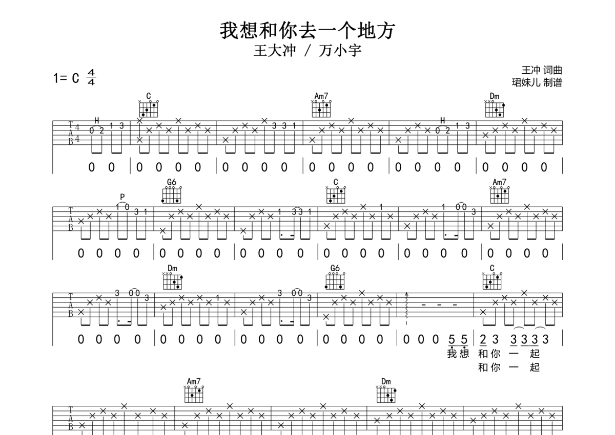 王大冲 / 万小宇《我想和你去一个地方》吉他谱 - C调弹唱六线谱
