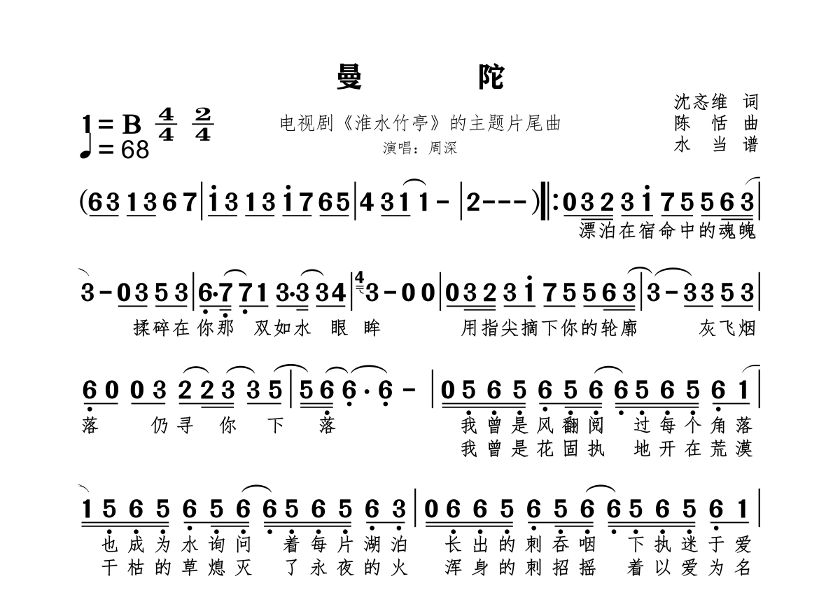 《曼陀》是周深演唱的一首歌曲,拍号为4/4拍,歌曲速度为每分钟68拍,这份简谱共有一张高清图谱,图谱由 @水当 编配上传电视剧《淮水竹亭》的主题片尾曲,原调B,纯简谱。