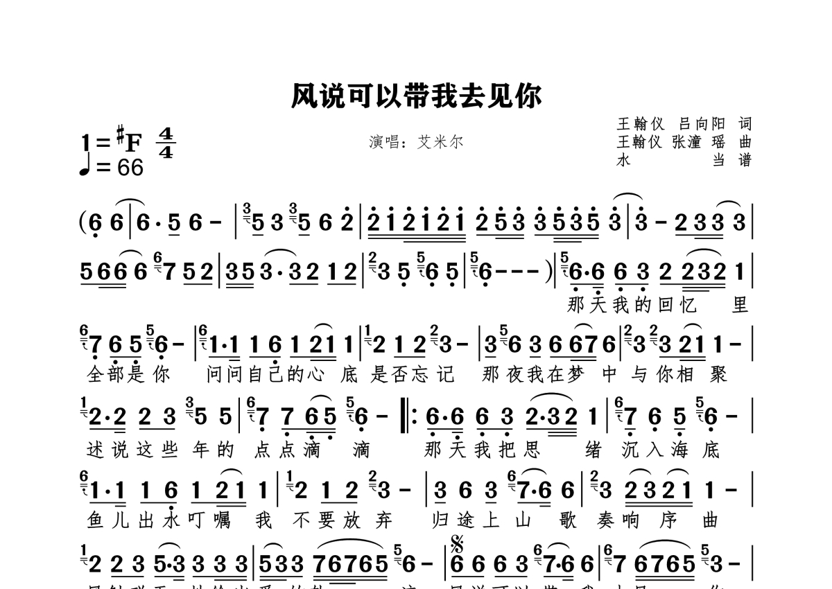 《风说可以带我去见你》是艾米尔演唱的一首歌曲,拍号为4/4拍,歌曲速度为每分钟66拍,这份简谱共有一张高清图谱,图谱由 @水当 编配上传原调#F纯间谱。