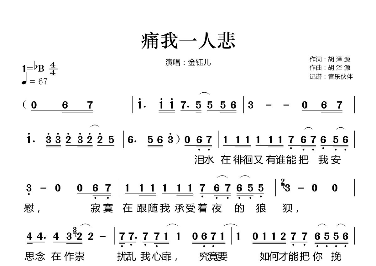 《痛我一人悲》是金钰儿演唱的一首歌曲,拍号为4/4拍,歌曲速度为每分钟67拍,这份简谱共有两张高清图谱,图谱由 @音乐伙伴 编配上传。