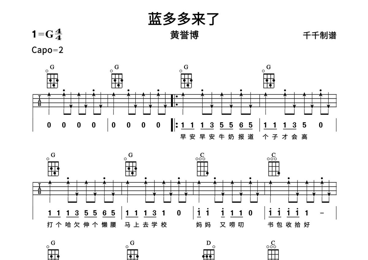 黄誉博《蓝多多来了》尤克里里谱 - G调尤克里里谱