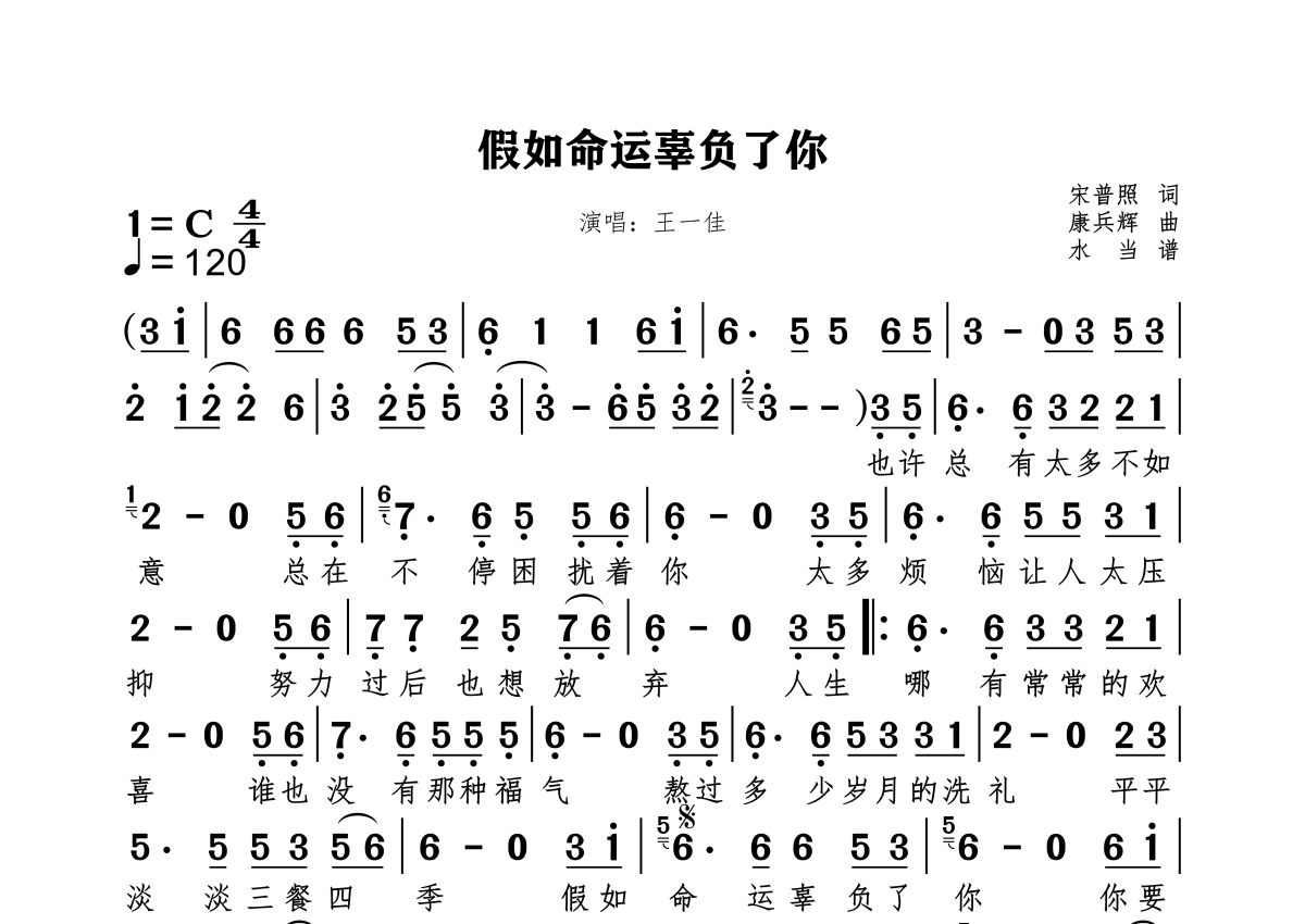 《假如命运辜负了你》是王一佳演唱的一首歌曲,拍号为4/4拍,歌曲速度为每分钟120拍,这份简谱共有一张高清图谱,图谱由 @水当 编配上传原调C纯简谱。