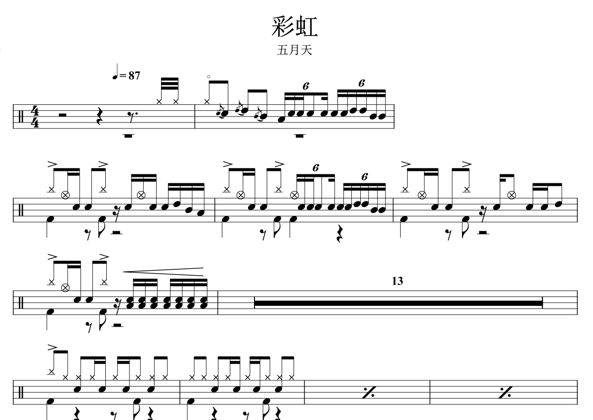 《彩虹》是五月天演唱的一首歌曲,拍号为4/4拍,歌曲速度为每分钟87拍,这份架子鼓谱共有三张高清图谱,图谱由 @音符喷血者 编配上传,图谱使用五线谱编配,使用这份彩虹架子鼓谱,你将能够轻松地敲打出这首五月天的彩虹,快来尝试吧。