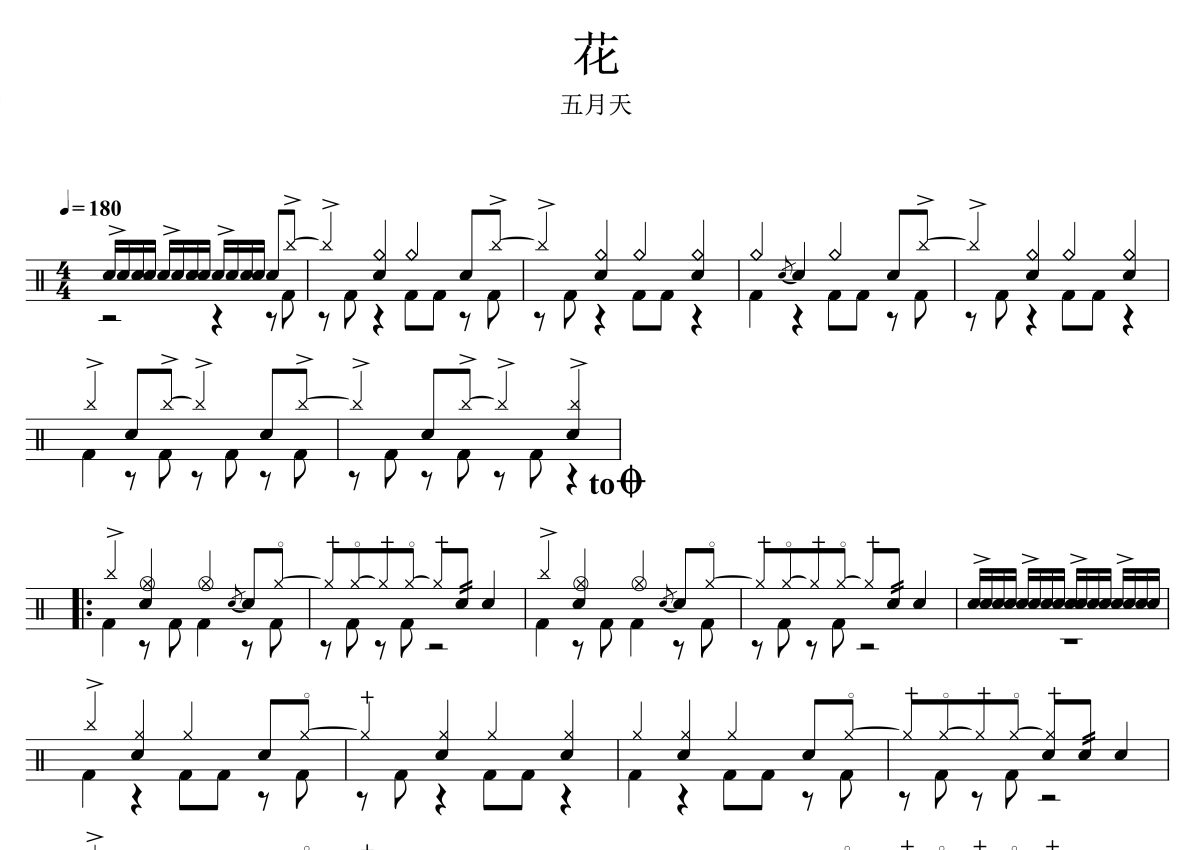 《花》是五月天演唱的一首歌曲,拍号为4/4拍,歌曲速度为每分钟180拍,这份架子鼓谱共有两张高清图谱,图谱由 @音符喷血者 编配上传,图谱使用五线谱编配,使用这份花架子鼓谱,你将能够轻松地敲打出这首五月天的花,快来尝试吧。