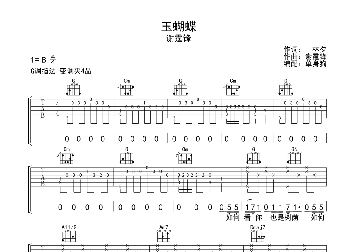 《玉蝴蝶》是谢霆锋演唱的一首歌曲,拍号为4/4拍,歌曲原调为B调,但由于原调指法比较难,为了方便弹奏,本吉他谱采用的是G调指法编配,变调夹4品弹奏即为原调,当然也可以根据自己的音域改变变调夹位置,或者通过改变和弦调性,以方便自己弹奏,这份吉他谱共有四张高清图谱,图谱由 @单身狗 编配上传,图谱使用六线谱编配,包含吉他和弦指法、简谱以及歌词部分,使用这份玉蝴蝶吉他谱,可以让你更加方便地掌握这首歌曲的弹唱技巧,快来尝试吧。