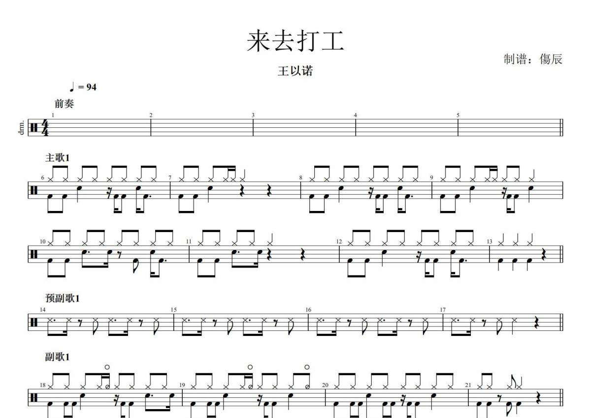 《来去打工》是王以诺王以诺演唱的一首歌曲,这份架子鼓谱共有两张高清图谱,图谱由 @打鼓的蟹老板 编配上传,图谱使用五线谱编配,使用这份来去打工架子鼓谱,你将能够轻松地敲打出这首王以诺王以诺的来去打工,快来尝试吧。