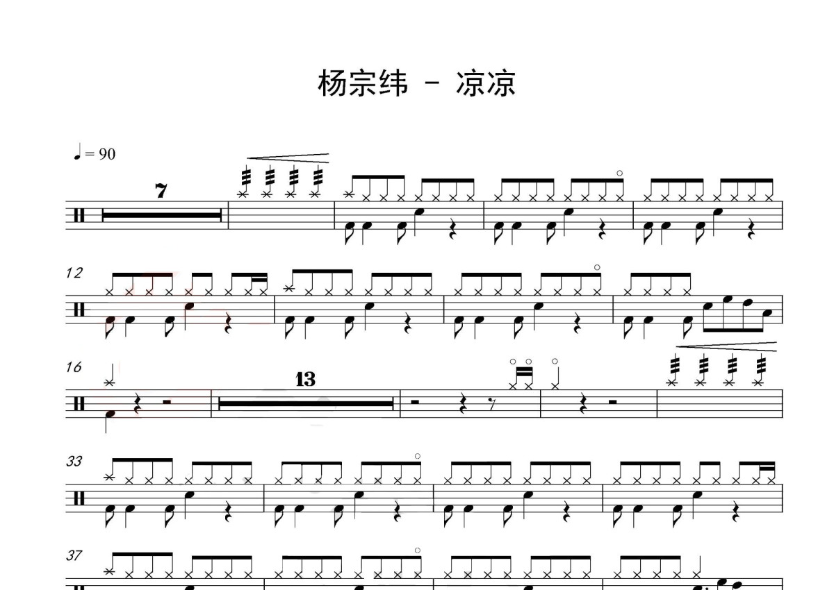 《凉凉》是杨宗纬演唱的一首歌曲,拍号为4/4拍,歌曲速度为每分钟90拍,这份架子鼓谱共有两张高清图谱,图谱由 @音符喷血者 编配上传,图谱使用五线谱编配,使用这份凉凉架子鼓谱,你将能够轻松地敲打出这首杨宗纬的凉凉,快来尝试吧。