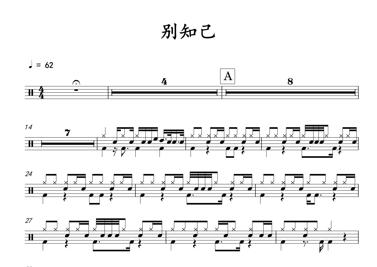 《别知己》是海来阿木演唱的一首歌曲,拍号为4/4拍,歌曲速度为每分钟62拍,这份架子鼓谱共有两张高清图谱,图谱由 @音符喷血者 编配上传,图谱使用五线谱编配,使用这份别知己架子鼓谱,你将能够轻松地敲打出这首海来阿木的别知己,快来尝试吧。