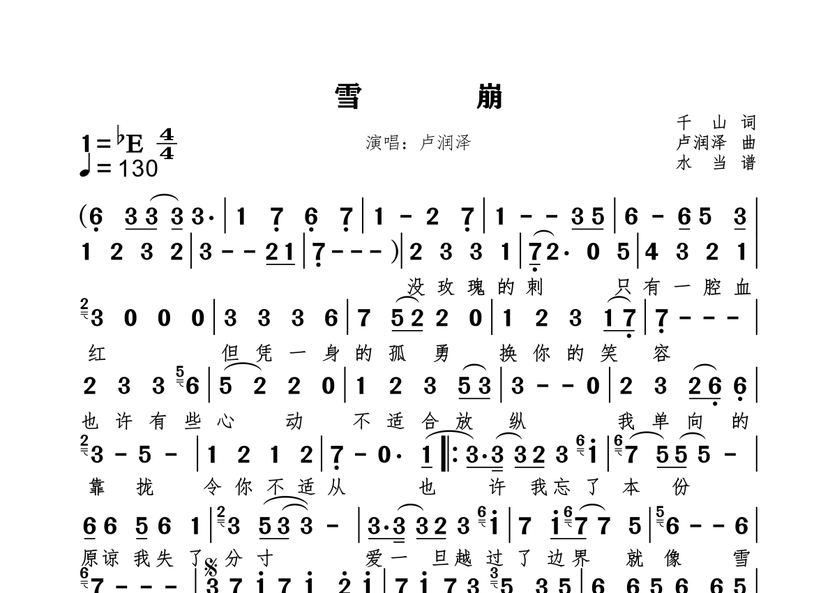 《雪崩》是卢润泽演唱的一首歌曲,拍号为4/4拍,歌曲速度为每分钟130拍,这份简谱共有一张高清图谱,图谱由 @水当 编配上传原调bE。