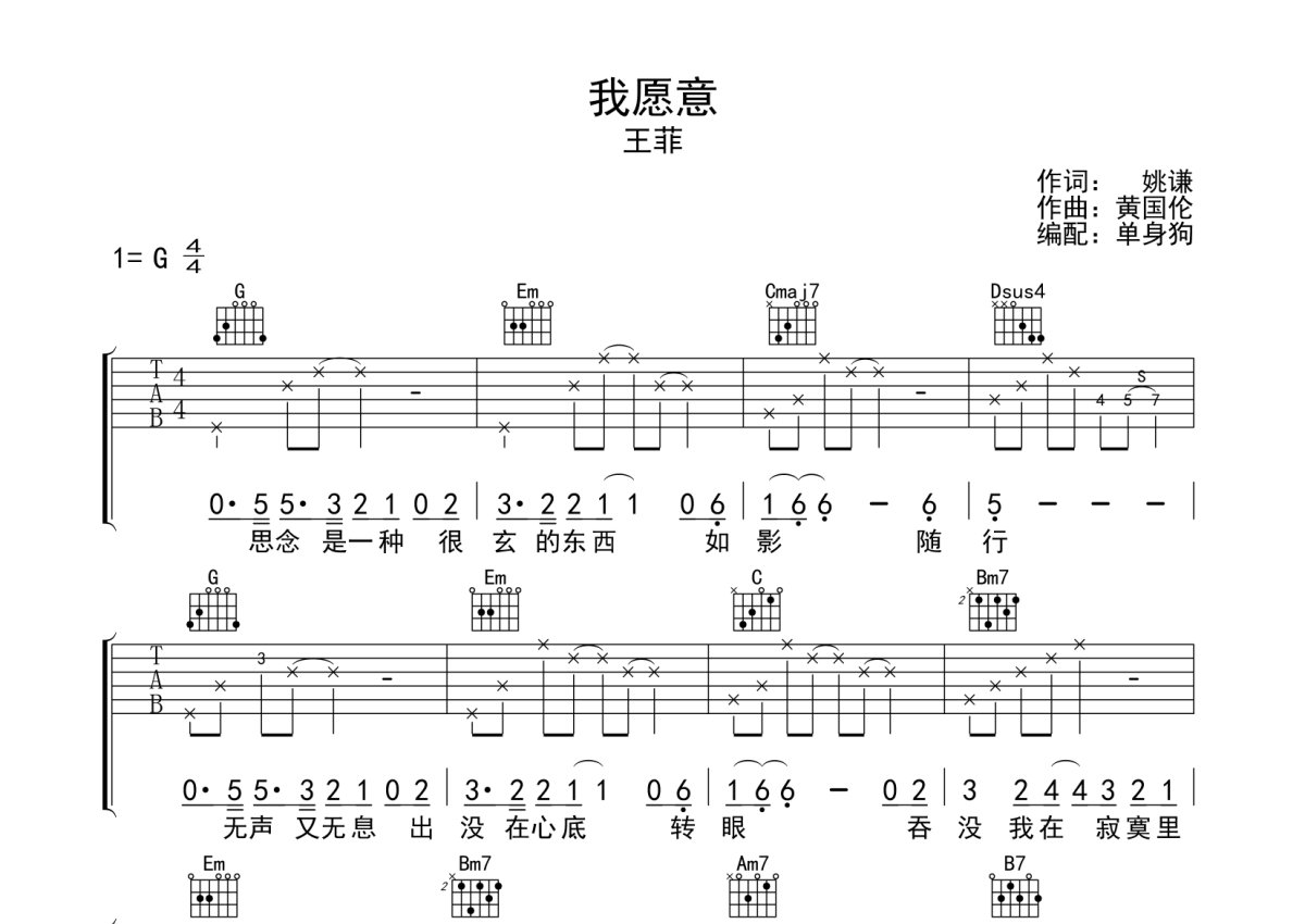 王菲《我愿意》吉他谱 - G调弹唱六线谱