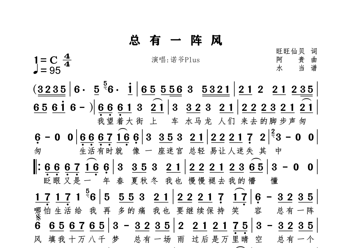 《总有一阵风》是诺爷Plus演唱的一首歌曲,拍号为4/4拍,歌曲速度为每分钟95拍,这份简谱共有一张高清图谱,图谱由 @水当 编配上传原调C。