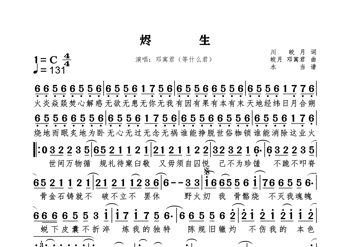 《烬生》是邓寓君(等什么君)演唱的一首歌曲,拍号为4/4拍,歌曲速度为每分钟131拍,这份简谱共有一张高清图谱,图谱由 @水当 编配上传原调C。