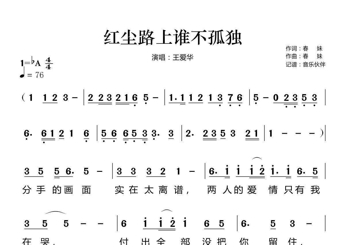红尘路上谁不孤独简谱 - 王爱华演唱