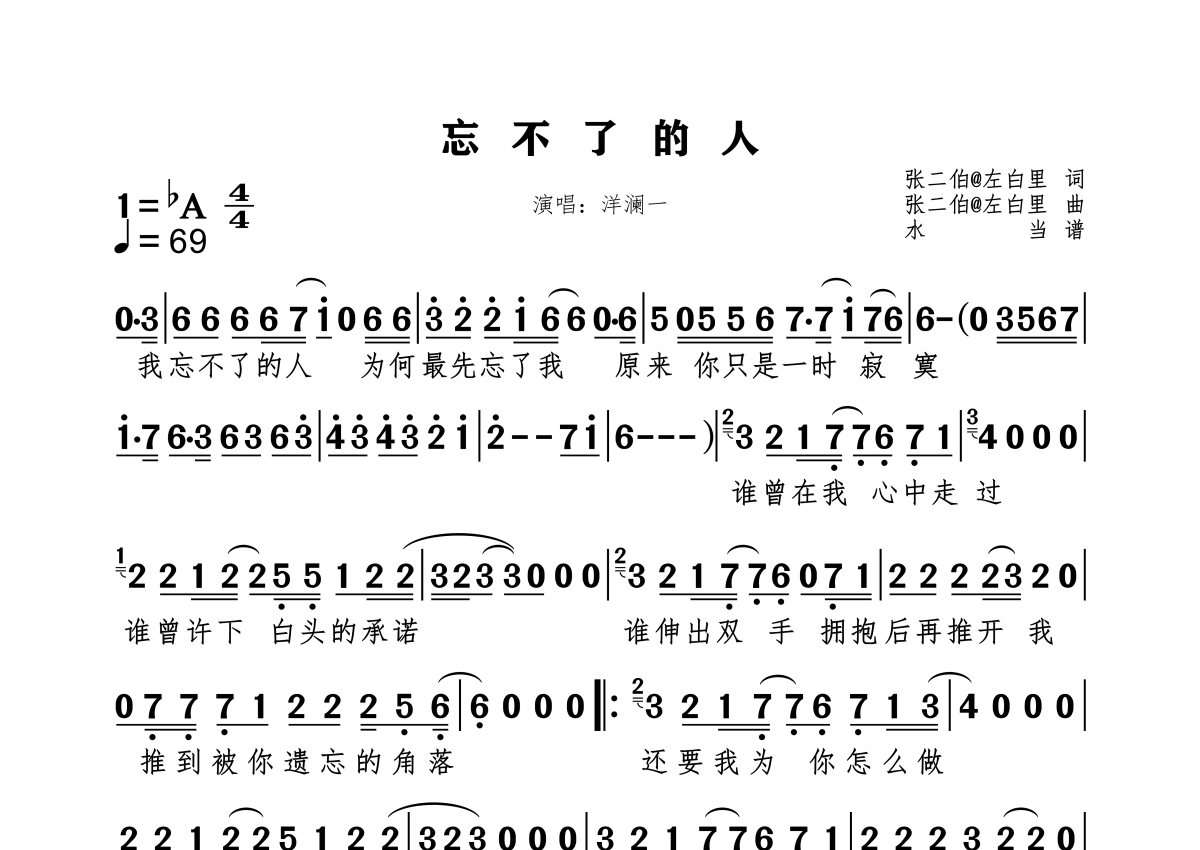 《忘不了的人》是洋澜一演唱的一首歌曲,拍号为4/4拍,歌曲速度为每分钟69拍,这份简谱共有一张高清图谱,图谱由 @水当 编配上传原调bA。