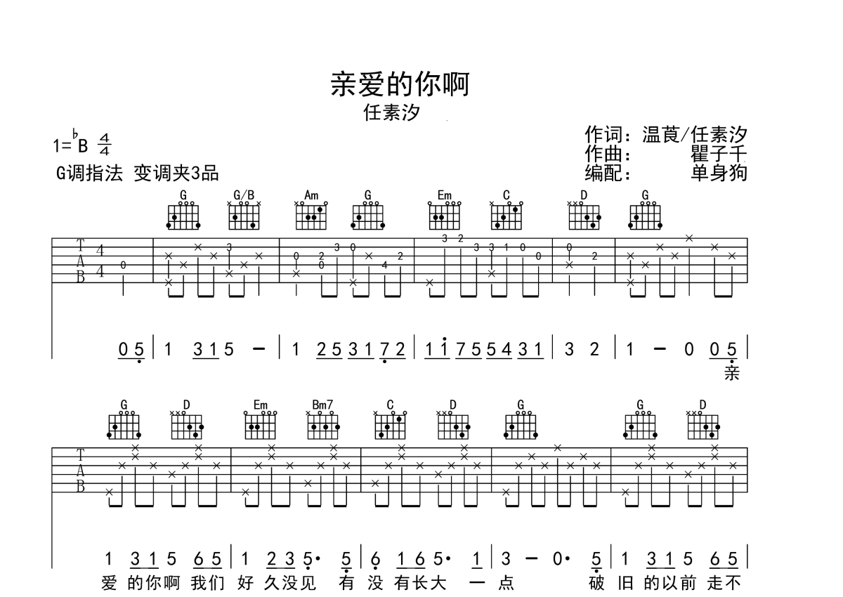 《亲爱的你啊》是任素汐演唱的一首歌曲,拍号为4/4拍,歌曲原调为Bb调,但由于原调指法比较难,为了方便弹奏,本吉他谱采用的是G调指法编配,变调夹3品弹奏即为原调,当然也可以根据自己的音域改变变调夹位置,或者通过改变和弦调性,以方便自己弹奏,这份吉他谱共有三张高清图谱,图谱由 @单身狗 编配上传,图谱使用六线谱编配,包含吉他和弦指法、简谱以及歌词部分,使用这份亲爱的你啊吉他谱,可以让你更加方便地掌握这首歌曲的弹唱技巧,快来尝试吧。