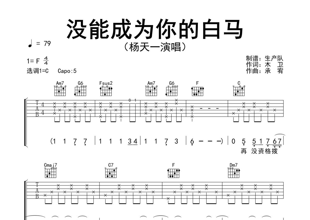 《没能成为你的白马》是杨天一演唱的一首歌曲,精编完美版,拍号为4/4拍,歌曲速度为每分钟79拍,歌曲原调为F调,但由于原调指法比较难,为了方便弹奏,本吉他谱采用的是C调指法编配,变调夹5品弹奏即为原调,当然也可以根据自己的音域改变变调夹位置,或者通过改变和弦调性,以方便自己弹奏,这份吉他谱共有三张高清图谱,图谱由 @生产队 编配上传,图谱使用六线谱编配,包含吉他和弦指法、简谱以及歌词部分,使用这份没能成为你的白马吉他谱,可以让你更加方便地掌握这首歌曲的弹唱技巧,快来尝试吧。杨天一演唱的歌曲《没能成为你的白马》原版吉他谱,含前奏、间奏solo编配,精编完美版,热门伤感情歌,值得推荐!。