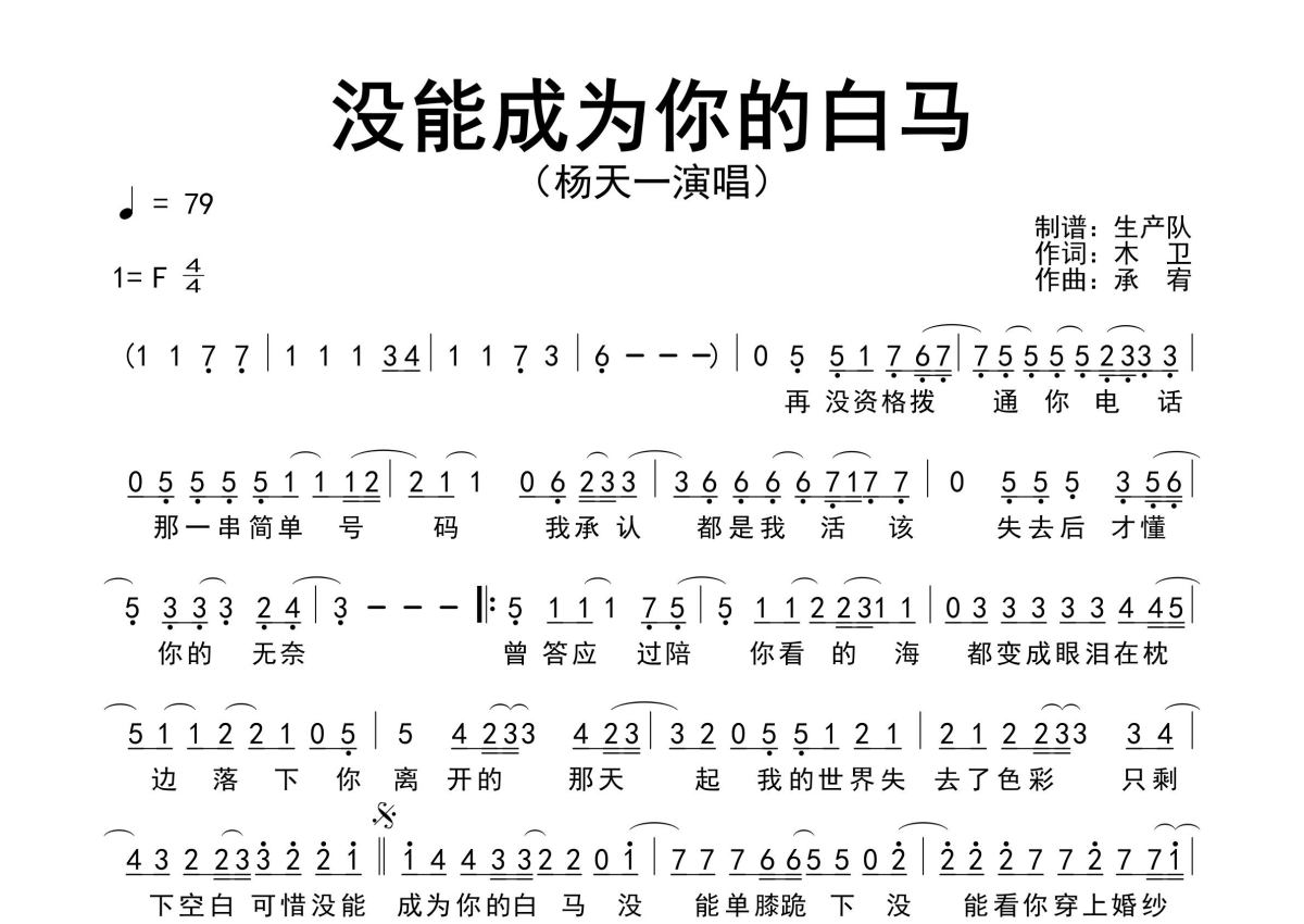 《没能成为你的白马》是杨天一演唱的一首歌曲,原版简谱,拍号为4/4拍,歌曲速度为每分钟79拍,这份简谱共有一张高清图谱,图谱由 @生产队 编配上传杨天一演唱的歌曲《没能成为你的白马》原版简谱,含前奏、间奏solo编配,精编完美版,热门伤感情歌,值得推荐!。