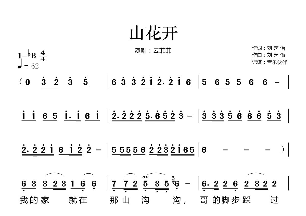 《山花开》是云菲菲演唱的一首歌曲,拍号为4/4拍,歌曲速度为每分钟62拍,这份简谱共有两张高清图谱,图谱由 @音乐伙伴 编配上传。