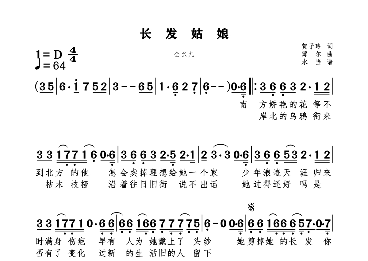 《长发姑娘》是全幺九演唱的一首歌曲,这份简谱共有一张高清图谱,图谱由 @水当 编配上传原调D。
