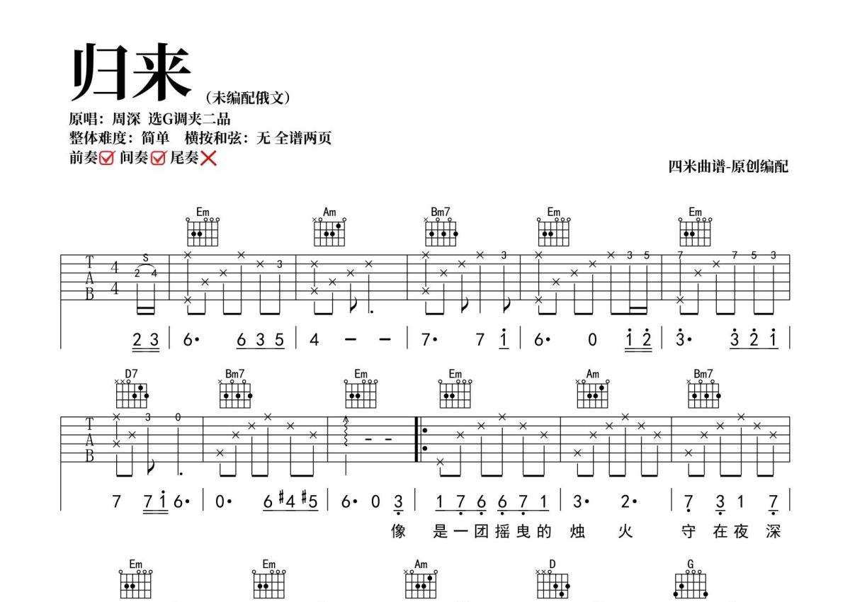 《归来》是周深周深演唱的一首歌曲,拍号为6/8拍,歌曲原调为A调,但由于原调指法比较难,为了方便弹奏,本吉他谱采用的是G调指法编配,变调夹2品弹奏即为原调,当然也可以根据自己的音域改变变调夹位置,或者通过改变和弦调性,以方便自己弹奏,这份吉他谱共有两张高清图谱,图谱由 @SRV7758521 编配上传,图谱使用六线谱编配,包含吉他和弦指法、简谱以及歌词部分,使用这份归来吉他谱,可以让你更加方便地掌握这首歌曲的弹唱技巧,快来尝试吧。