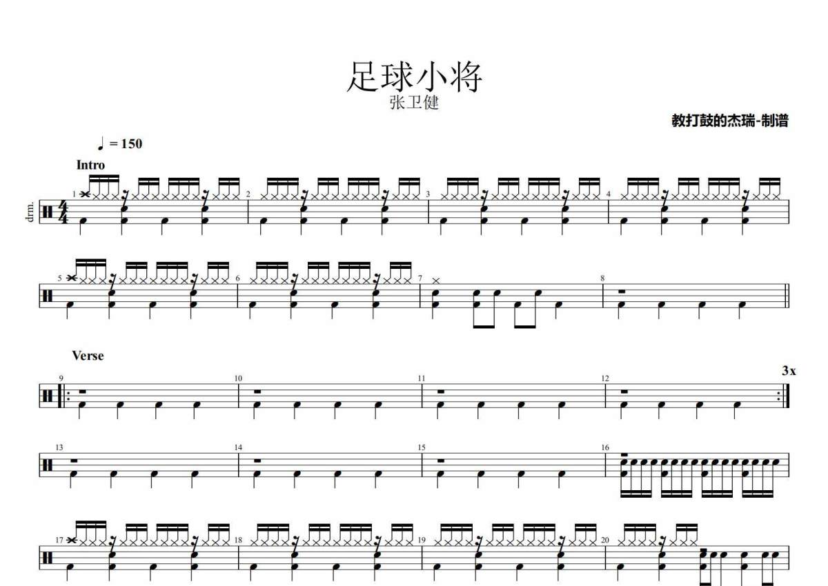 《足球小将》是张卫健演唱的一首歌曲,拍号为4/4拍,歌曲速度为每分钟150拍,这份架子鼓谱共有两张高清图谱,图谱由 @Jerry 编配上传,图谱使用五线谱编配,使用这份足球小将架子鼓谱,你将能够轻松地敲打出这首张卫健的足球小将,快来尝试吧。