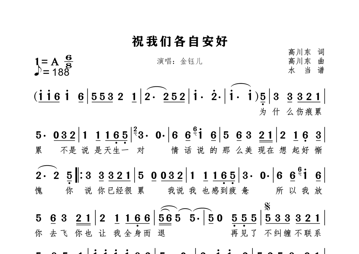 《祝我们各自安好》是金钰儿演唱的一首歌曲,拍号为6/8拍,歌曲速度为每分钟188拍,这份简谱共有一张高清图谱,图谱由 @水当 编配上传原调A。