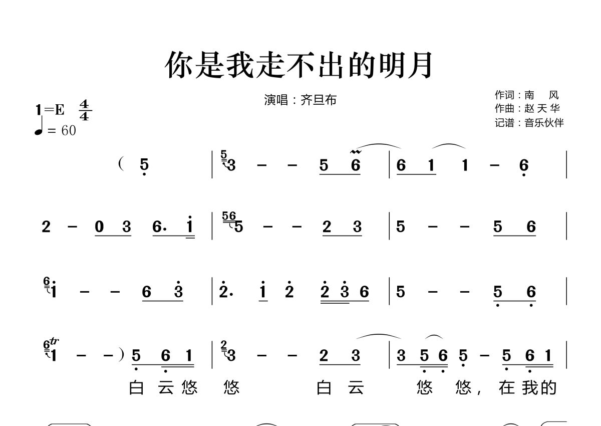 《你是我走不出的明月》是齐旦布演唱的一首歌曲,这份简谱共有三张高清图谱,图谱由 @音乐伙伴 编配上传。